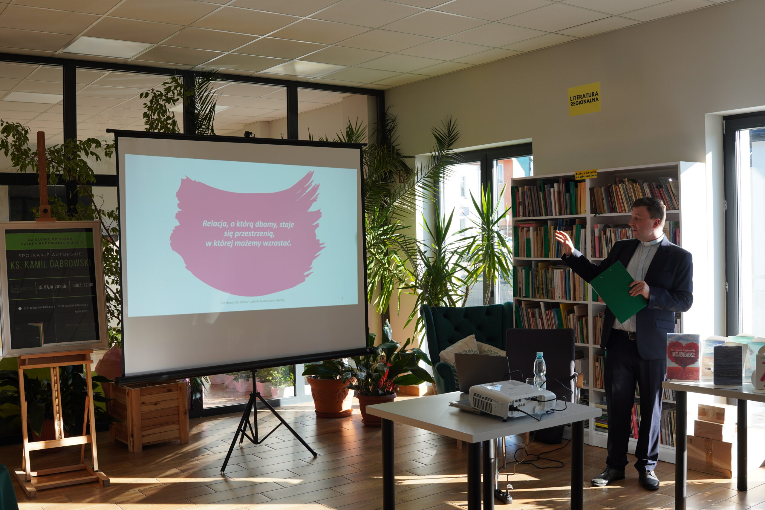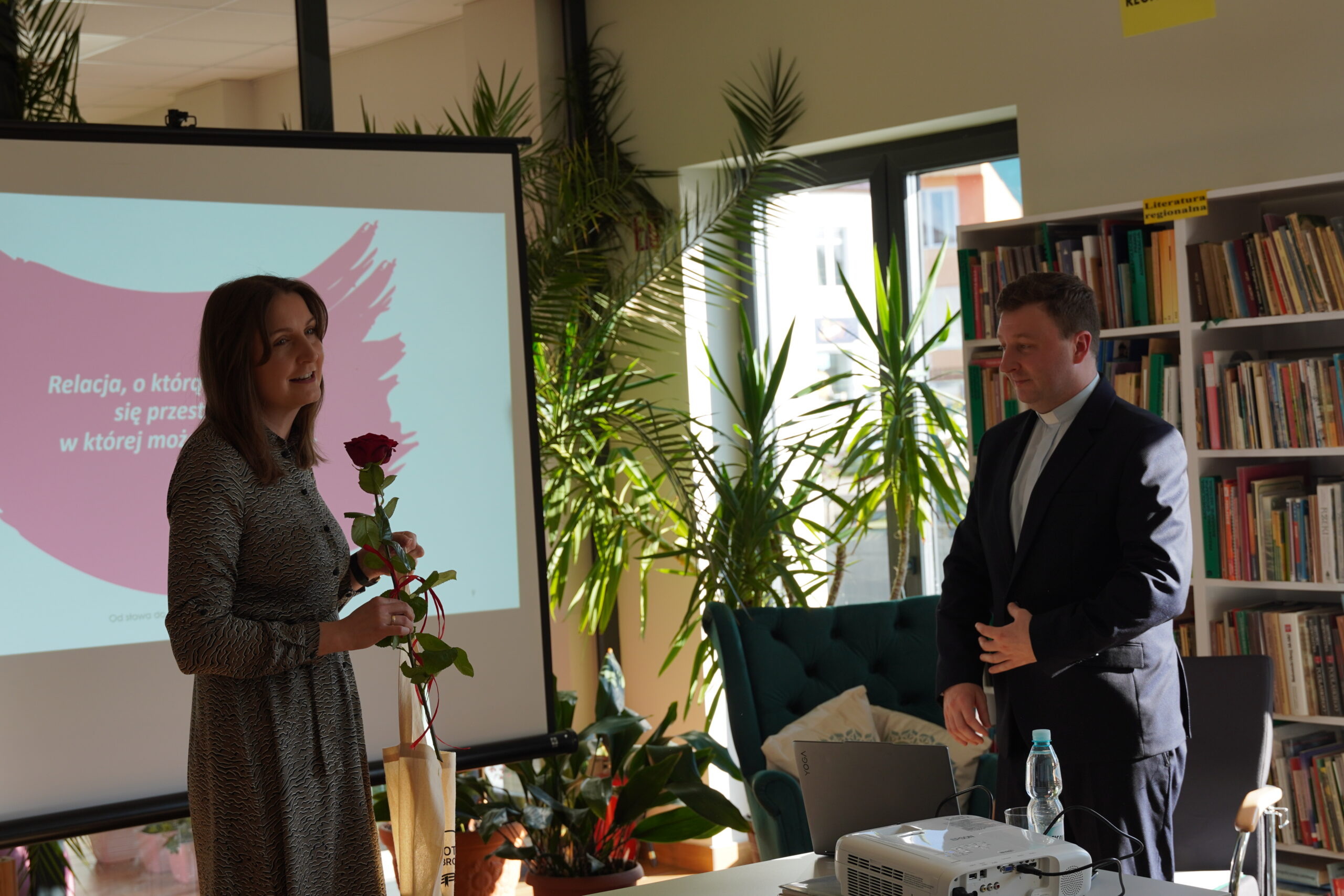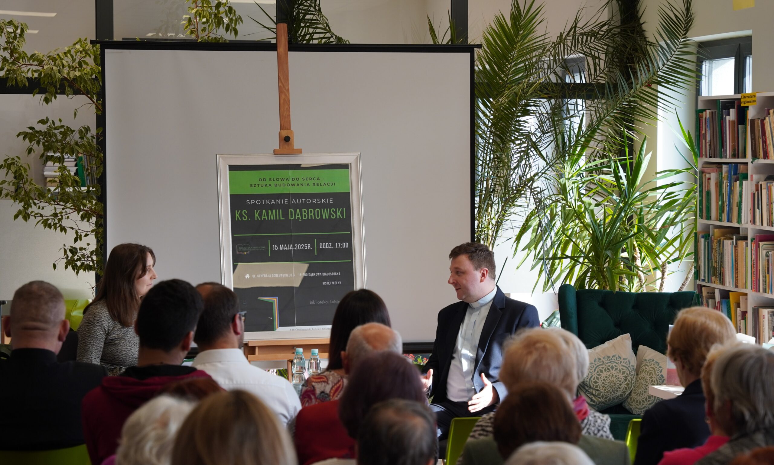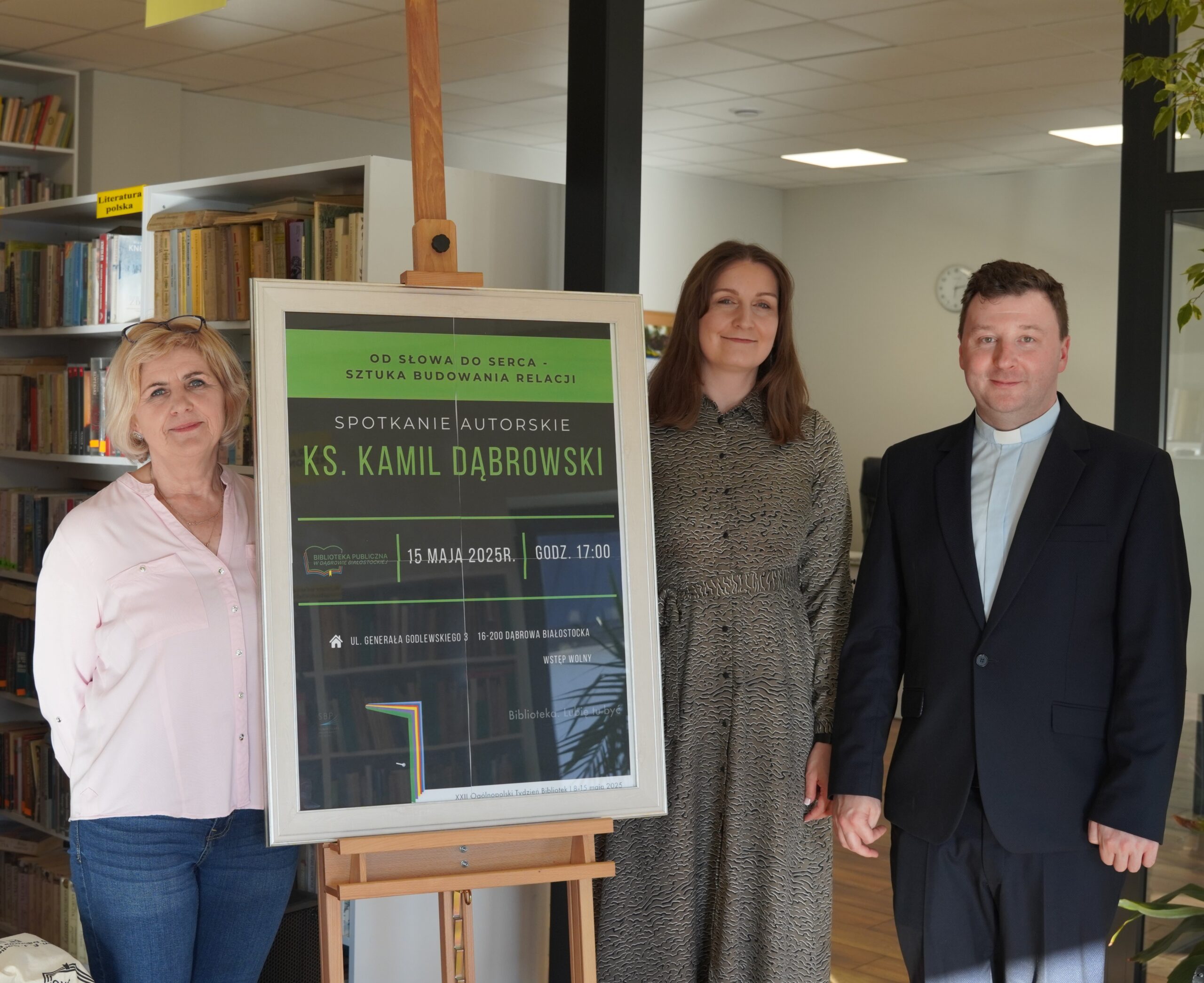 Dziękujemy serdecznie Księdzu Kamilowi Dąbrowskiemu za inspirujące spotkanie. Nie tylko mieliśmy okazję poznać Księdza jako autora, ale również wysłuchać niezwykle wartościowej prelekcji na temat sztuki budowania relacji pt.: „Od słowa do serca. Sztuka budowania relacji”. Te cenne wskazówki i refleksje z pewnością na długo pozostaną w naszych sercach i umysłach. Dziękujemy za otwartość, za podzielenie się swoimi doświadczeniami i myślami. To było dla nas wszystkich bardzo ubogacające spotkanie, idealnie wpisujące się w obchody XXII. Ogólnopolskiego Tygodnia Bibliotek i jego hasło „Biblioteka. Lubię tu być”.
