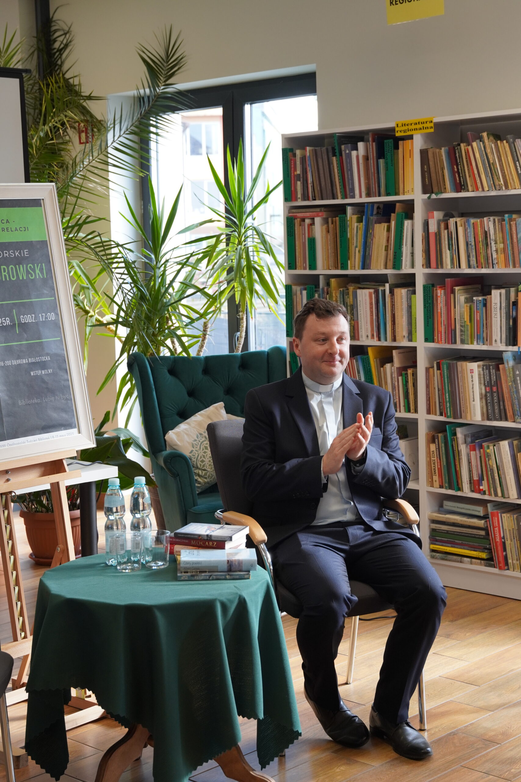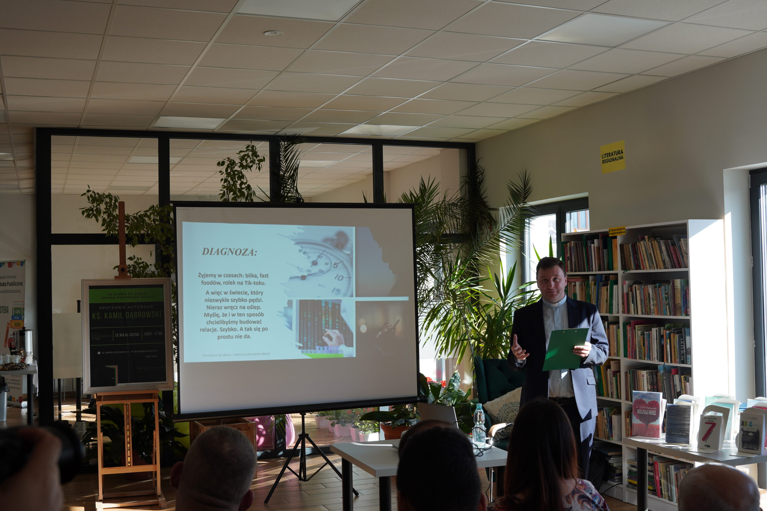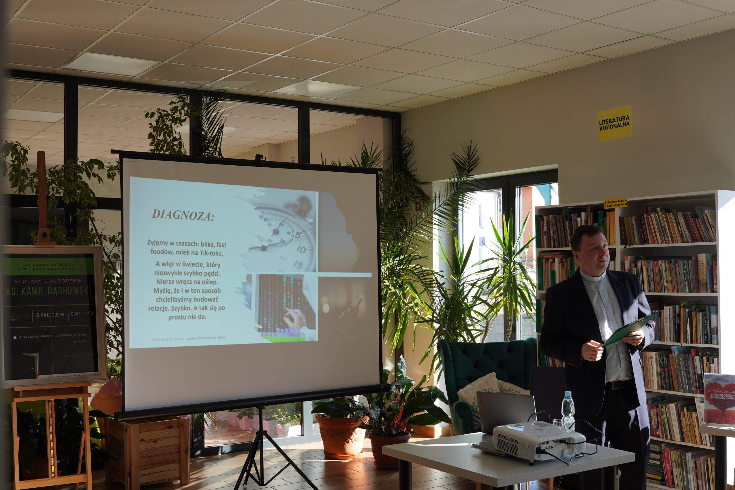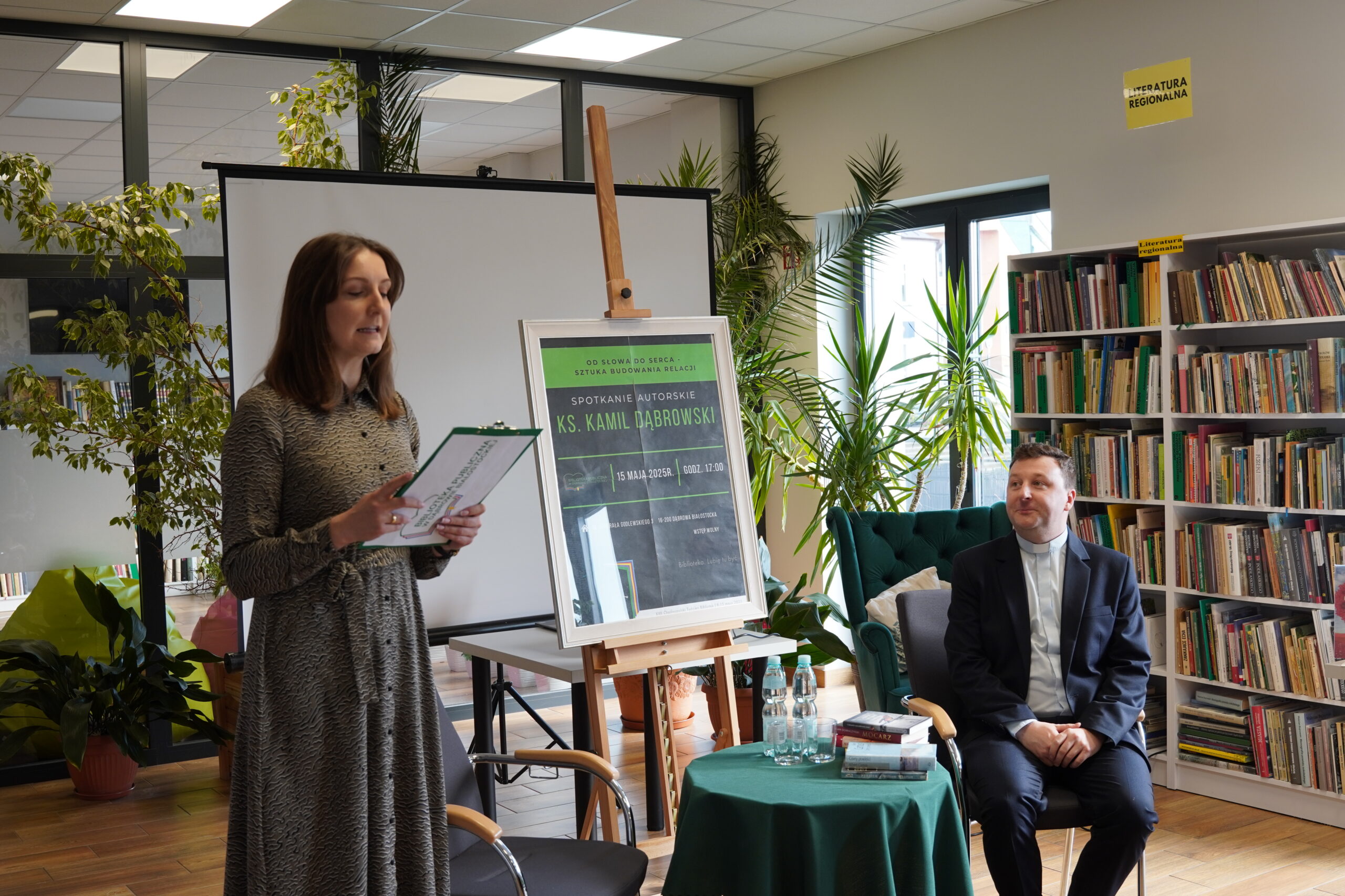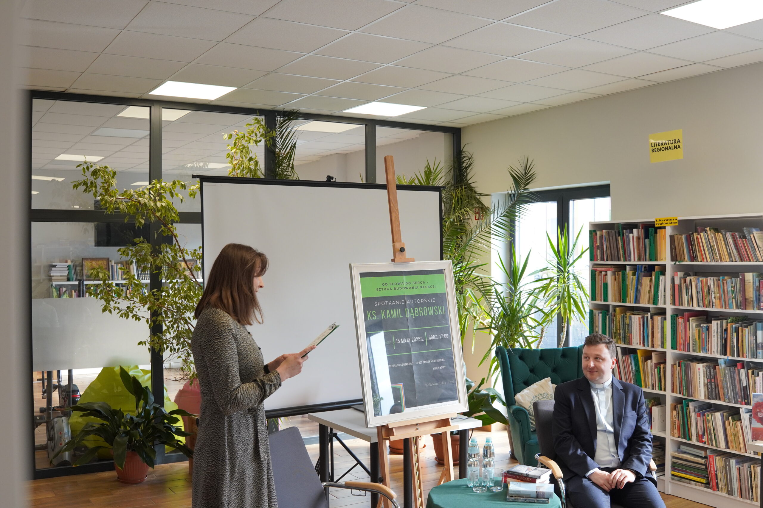 Dziękujemy serdecznie Księdzu Kamilowi Dąbrowskiemu za inspirujące spotkanie. Nie tylko mieliśmy okazję poznać Księdza jako autora, ale również wysłuchać niezwykle wartościowej prelekcji na temat sztuki budowania relacji pt.: „Od słowa do serca. Sztuka budowania relacji”. Te cenne wskazówki i refleksje z pewnością na długo pozostaną w naszych sercach i umysłach. Dziękujemy za otwartość, za podzielenie się swoimi doświadczeniami i myślami. To było dla nas wszystkich bardzo ubogacające spotkanie, idealnie wpisujące się w obchody XXII. Ogólnopolskiego Tygodnia Bibliotek i jego hasło „Biblioteka. Lubię tu być”.