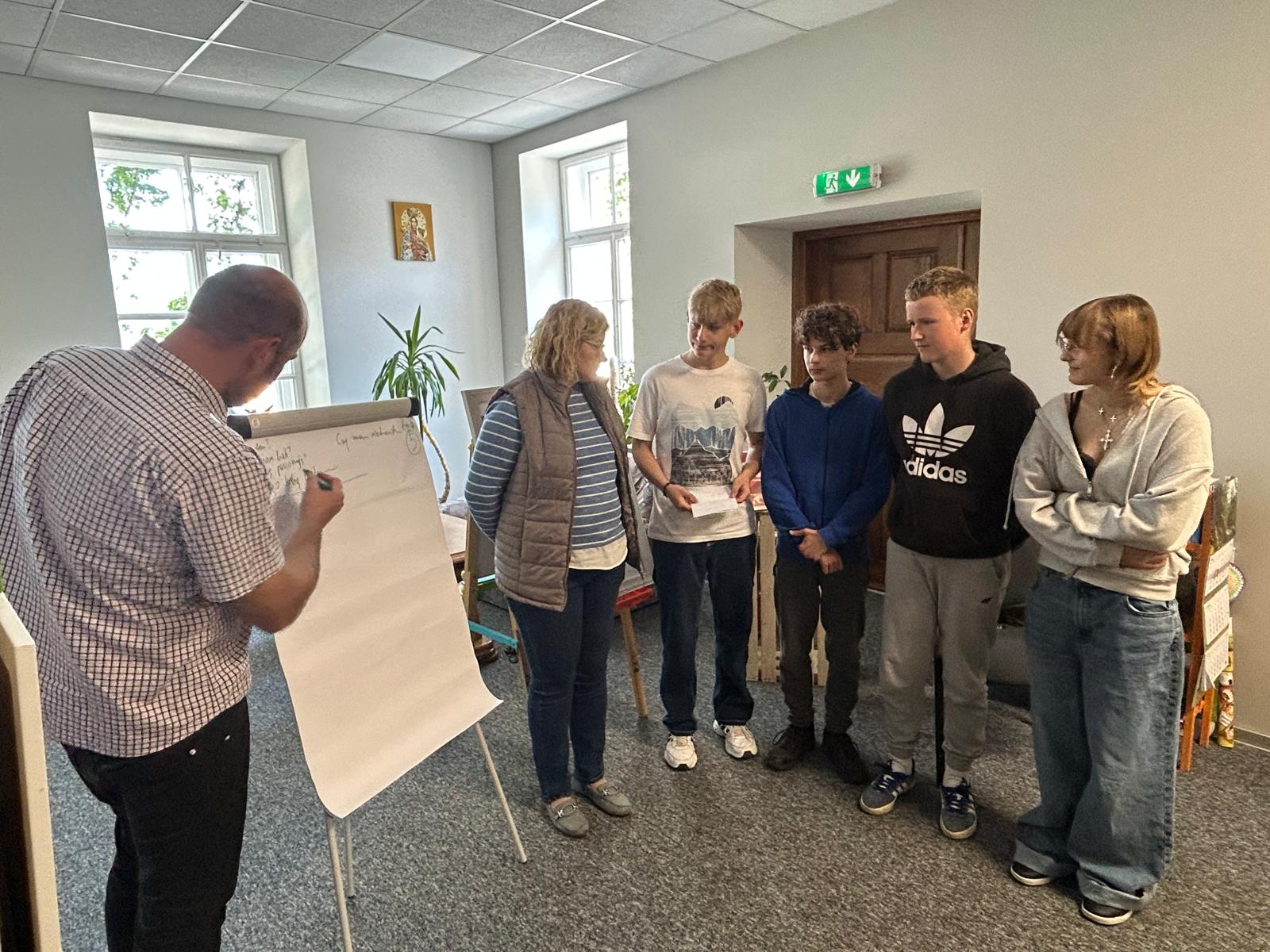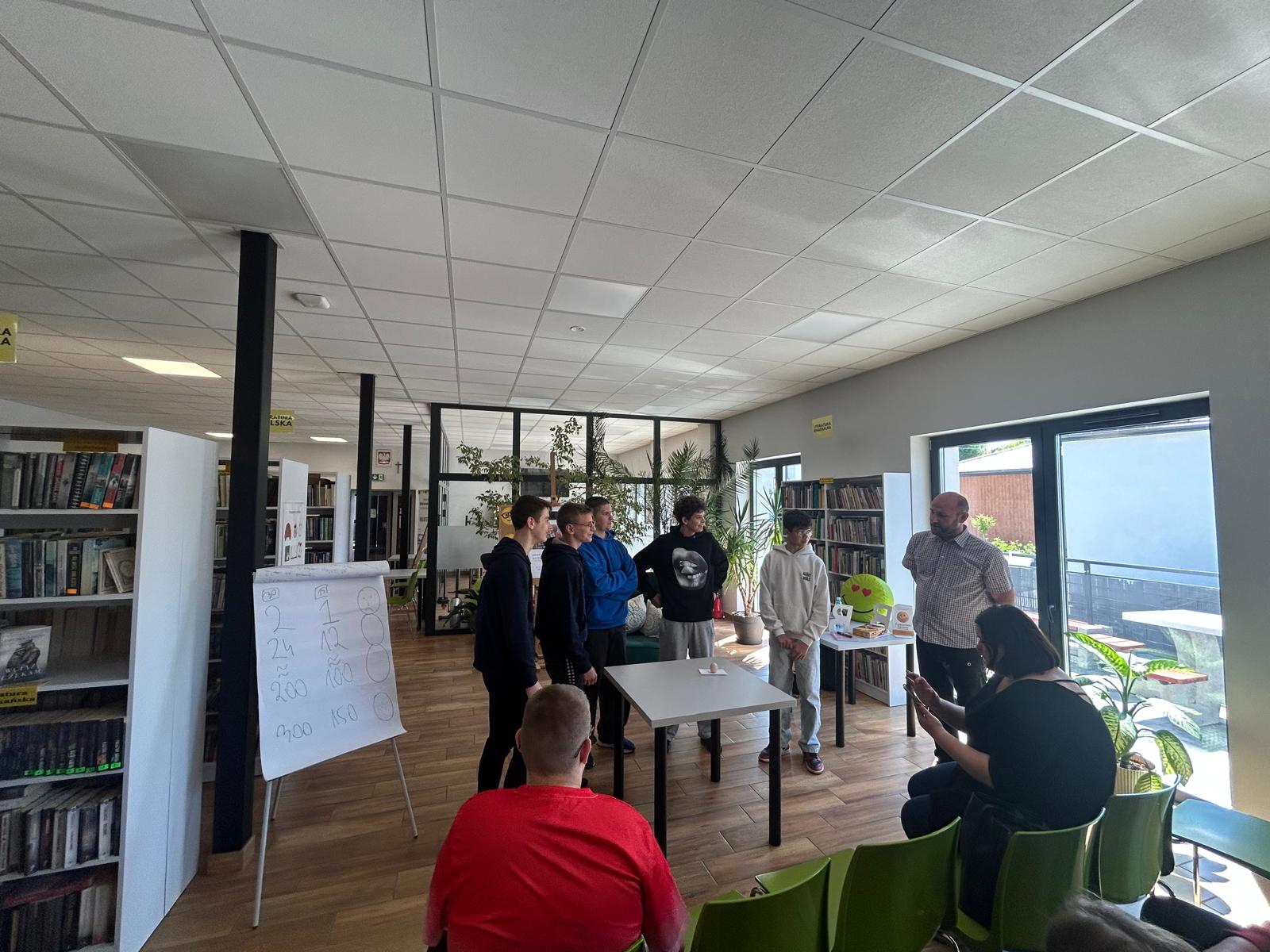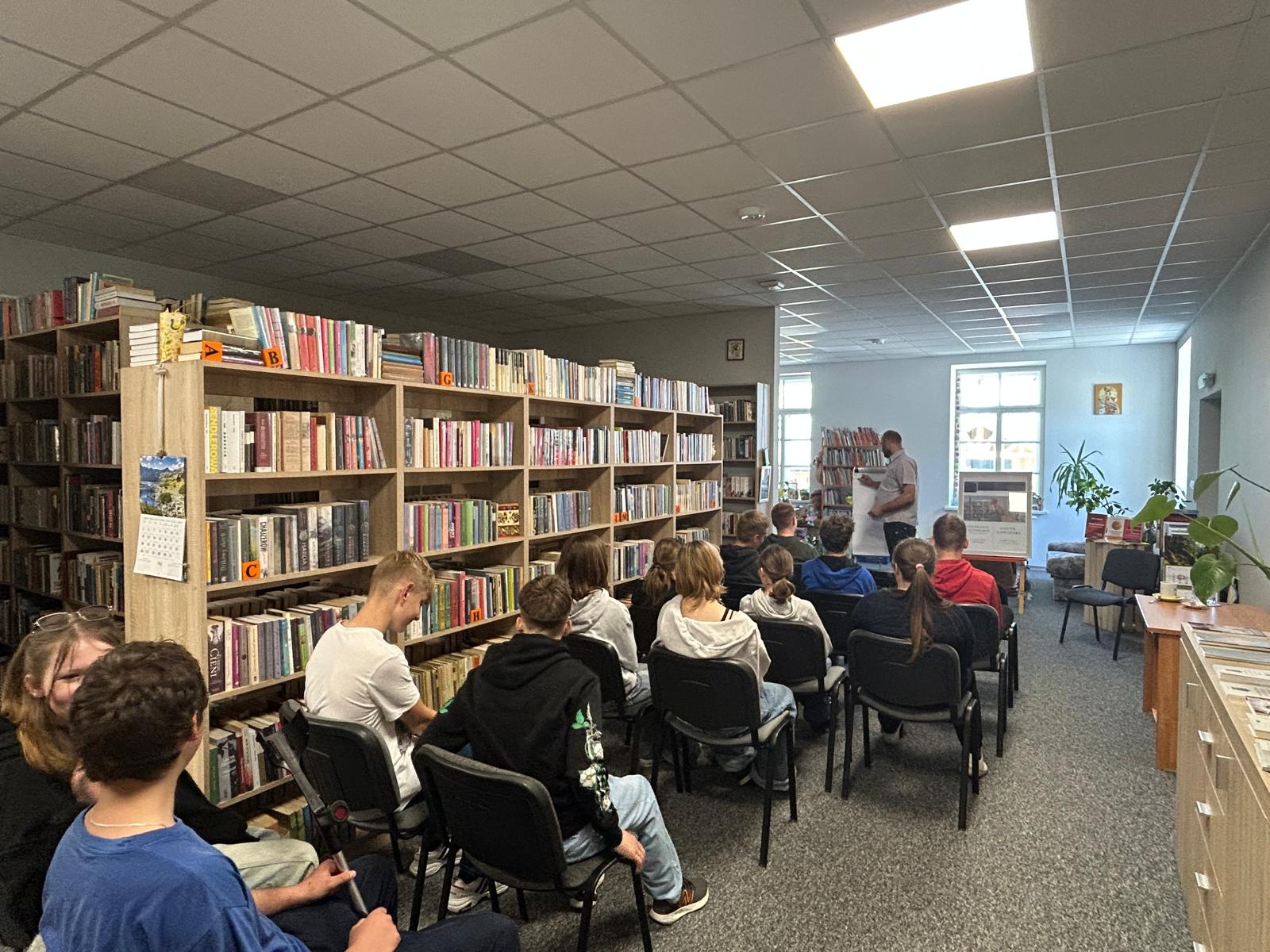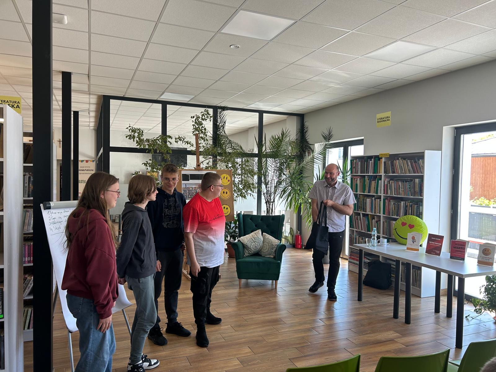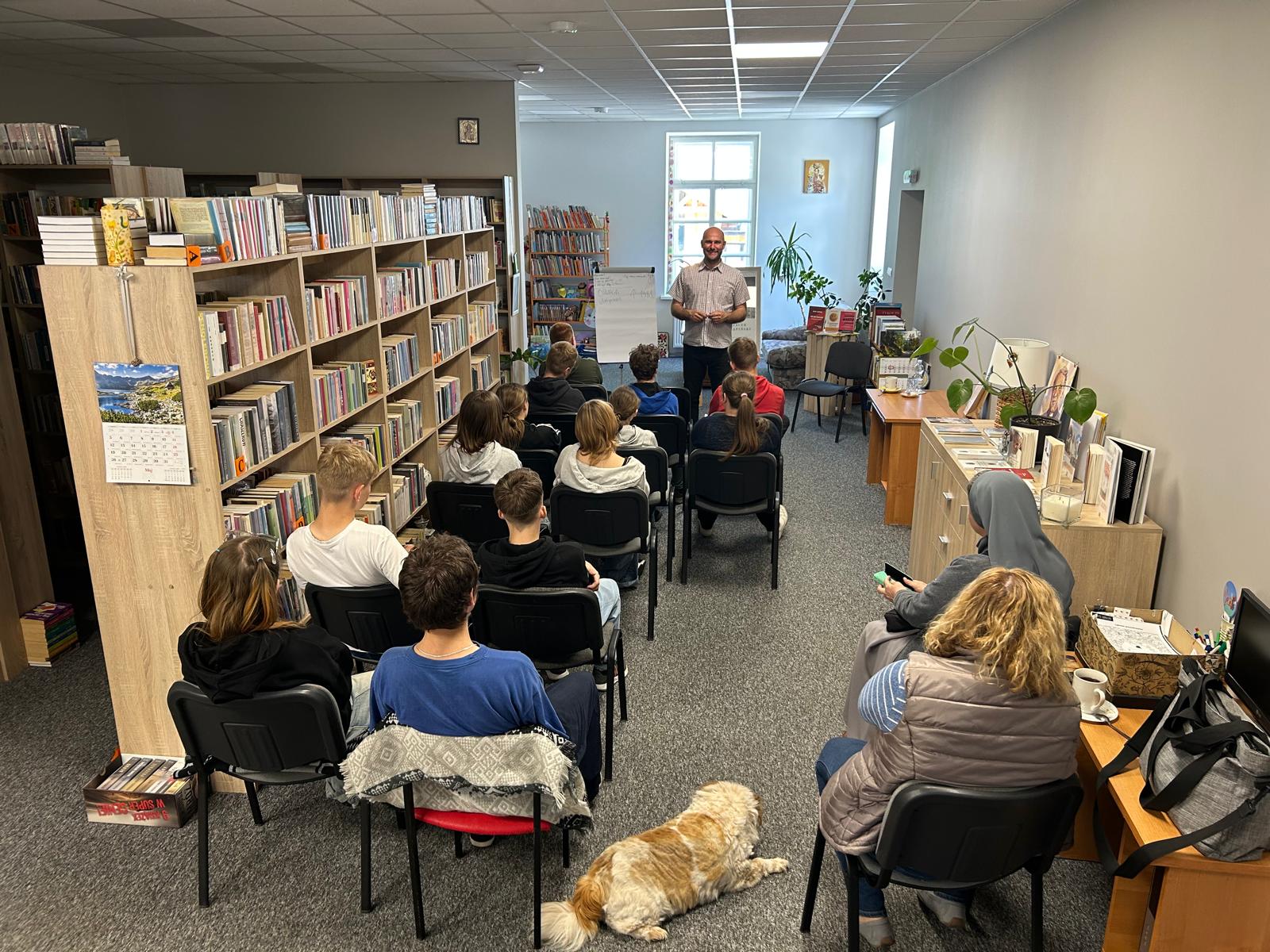 Pan Jacek Łapiński w niezwykle przystępny i angażujący sposób opowiadał o tym, jak książki mogą wzbogacać życie, rozwijać wyobraźnię, poszerzać horyzonty i uczyć empatii. Autor dzielił się swoimi osobistymi doświadczeniami i przemyśleniami na temat roli literatury w życiu człowieka, podkreślając jej terapeutyczną i rozwojową moc. Młodzież miała okazję zadawać pytania, aktywnie uczestniczyć w prelekcji, a nawet zdobyć słodką nagrodę. Dodatkowym, bardzo mile widzianym,  gościem był piesek mieszkający nieopodal biblioteki w Różanymstoku, który spędził z nami całe spotkanie 🙂