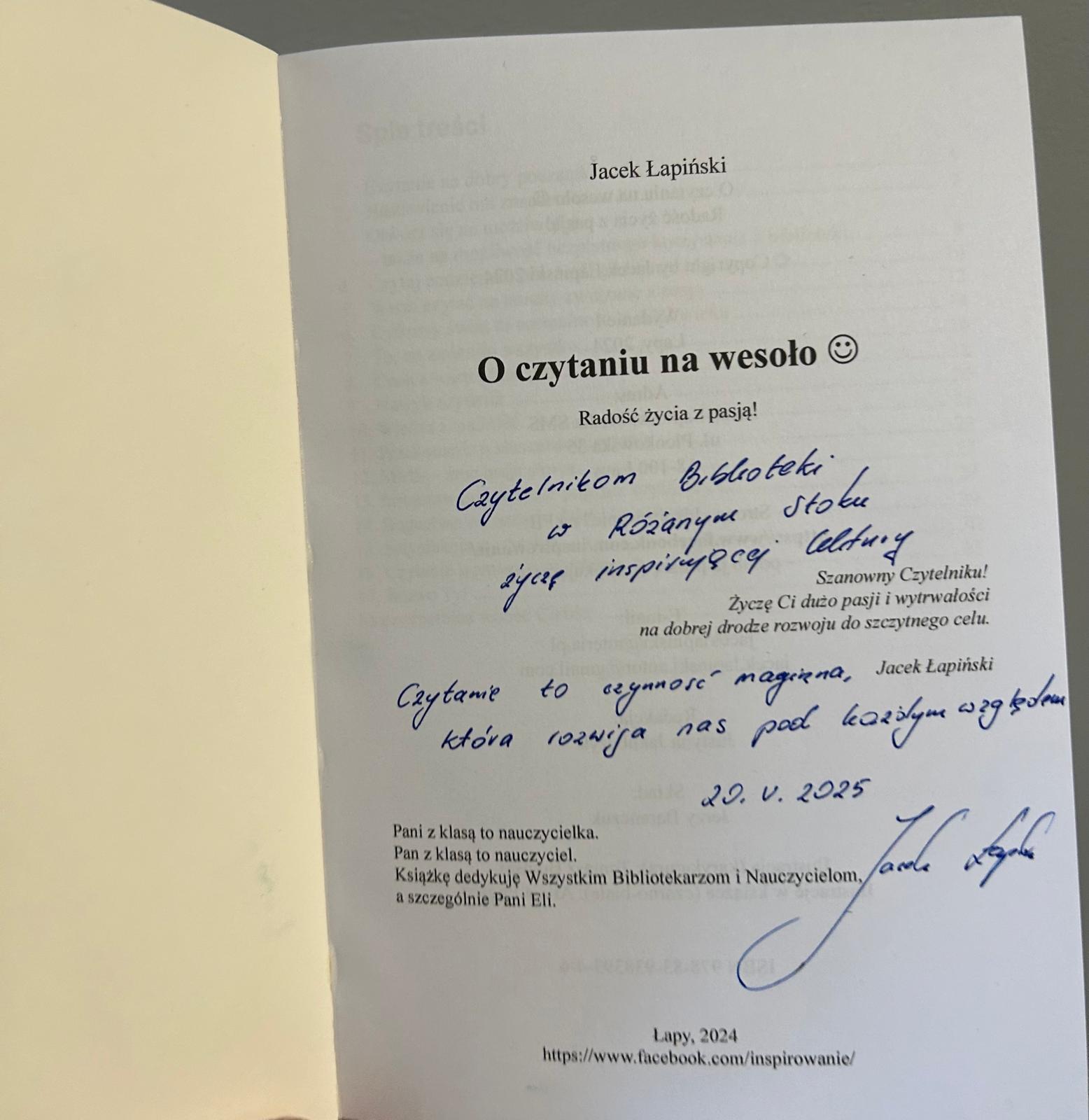 Zachęcamy do zapoznania się z twórczością Pana Jacka Łapińskiego – w naszych zbiorach bibliotecznych (zarówno w Dąbrowie Białostockiej, jak i w Różanymstoku) dostępne są książki autora z autografami.