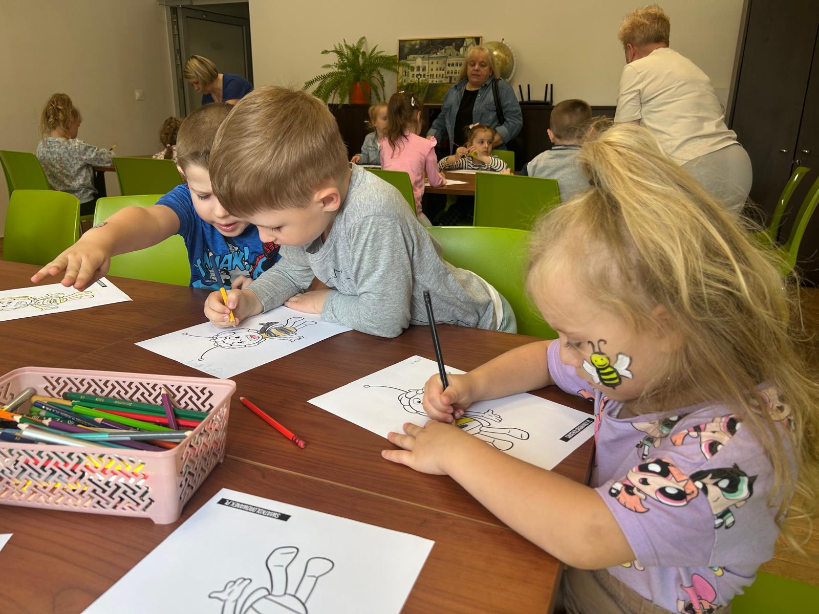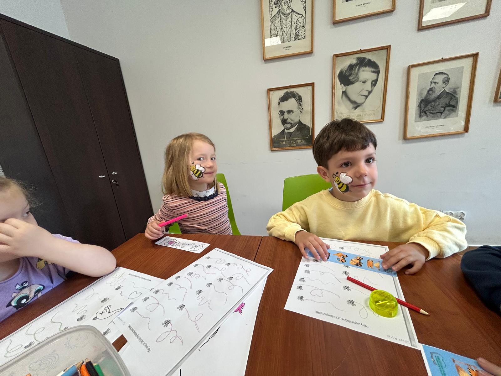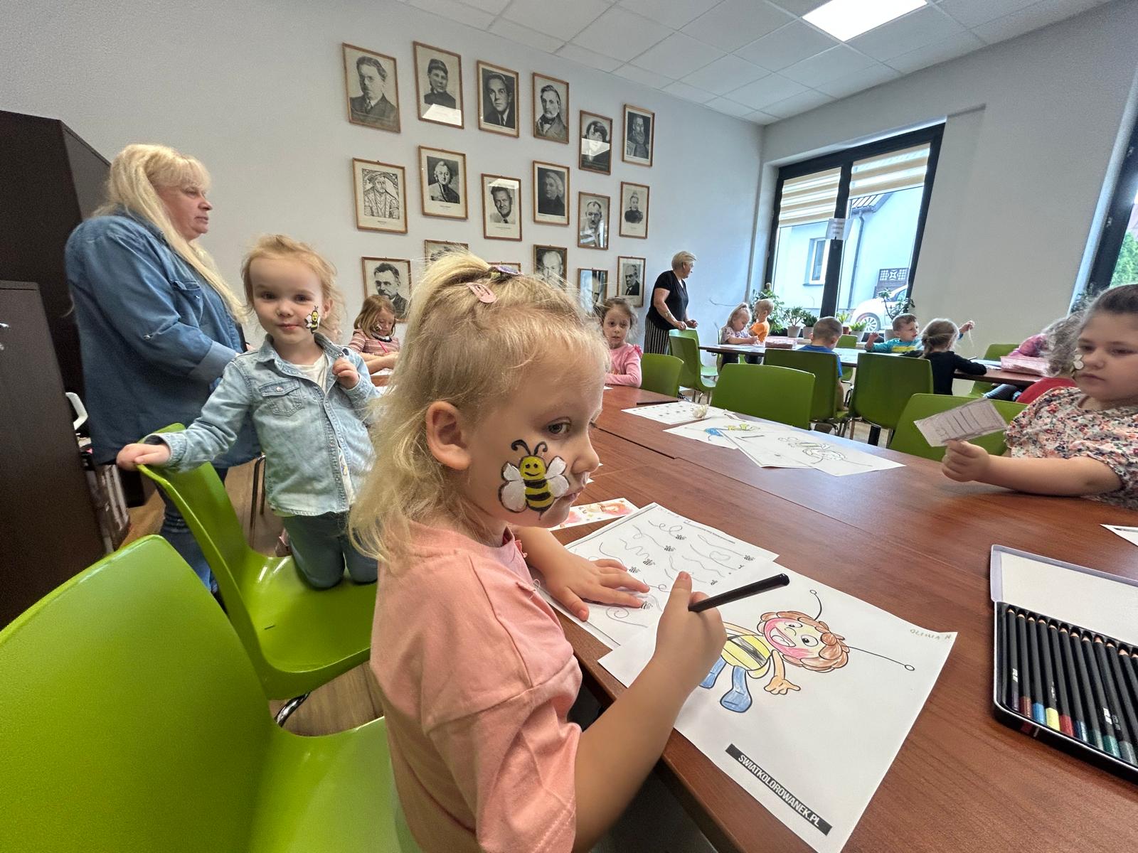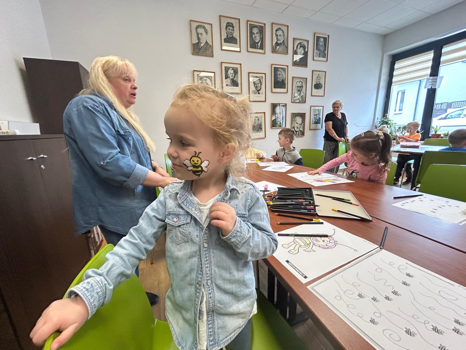 Dzisiaj gościliśmy wyjątkowych czytelników – grupę Pszczółki z Samorządowego Przedszkola w Dąbrowie Białostockiej, które przybyły wraz ze swoimi opiekunami. Przedszkolaki z ogromnym zaciekawieniem zwiedzały bibliotekę, odkrywając magiczny świat książek. Miały okazję zobaczyć, jak wiele wspaniałych historii czeka na swoich czytelników na kolorowych półkach.Wspólnie wykonaliśmy prace plastyczne inspirowane przygodami Pszczółki Mai oraz zakładki do książek. Dodatkowymi atrakcjami, ku wielkiej radości dzieci, były możliwość skorzystania ze ścianki wspinaczkowej oraz malowanie twarzy – Basia i Dorota z M-GOK wyczarowały na ich policzkach śliczne pszczółki.