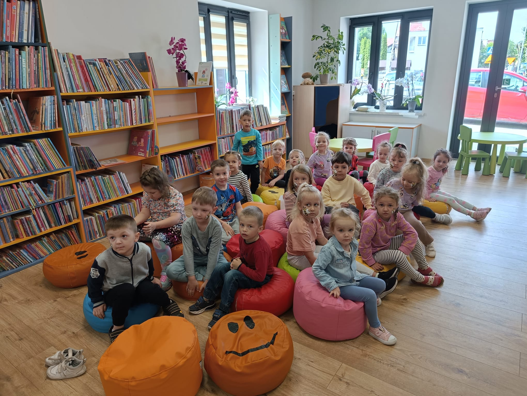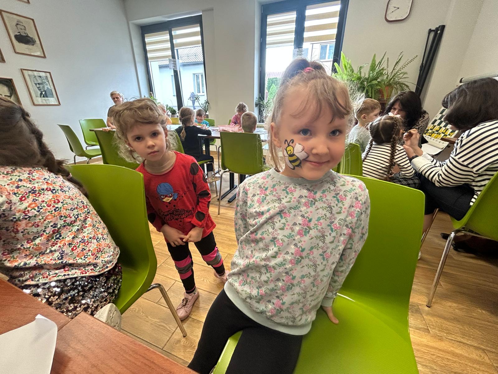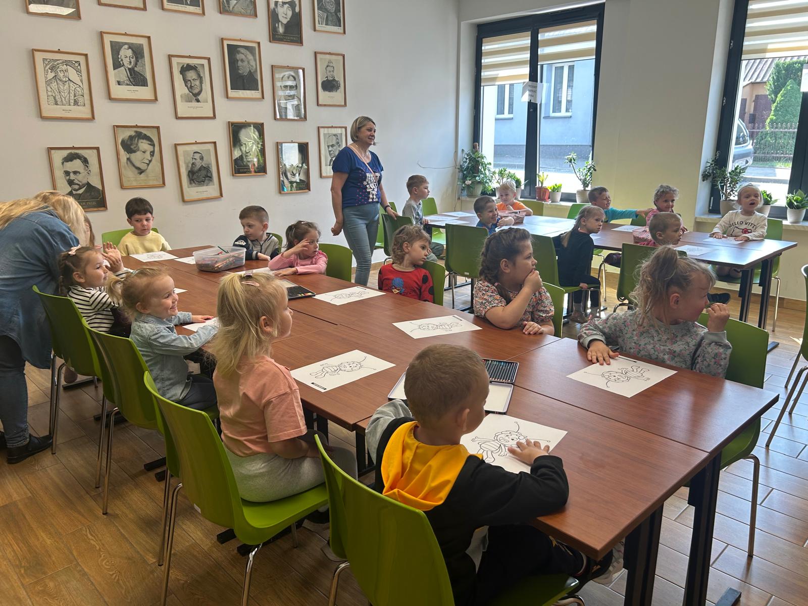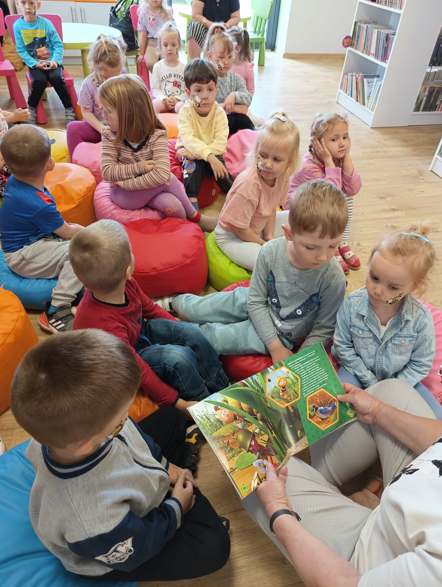 Dzisiaj gościliśmy wyjątkowych czytelników – grupę Pszczółki z Samorządowego Przedszkola w Dąbrowie Białostockiej, które przybyły wraz ze swoimi opiekunami. Przedszkolaki z ogromnym zaciekawieniem zwiedzały bibliotekę, odkrywając magiczny świat książek. Miały okazję zobaczyć, jak wiele wspaniałych historii czeka na swoich czytelników na kolorowych półkach.Wspólnie wykonaliśmy prace plastyczne inspirowane przygodami Pszczółki Mai oraz zakładki do książek. Dodatkowymi atrakcjami, ku wielkiej radości dzieci, były możliwość skorzystania ze ścianki wspinaczkowej oraz malowanie twarzy – Basia i Dorota z M-GOK wyczarowały na ich policzkach śliczne pszczółki.