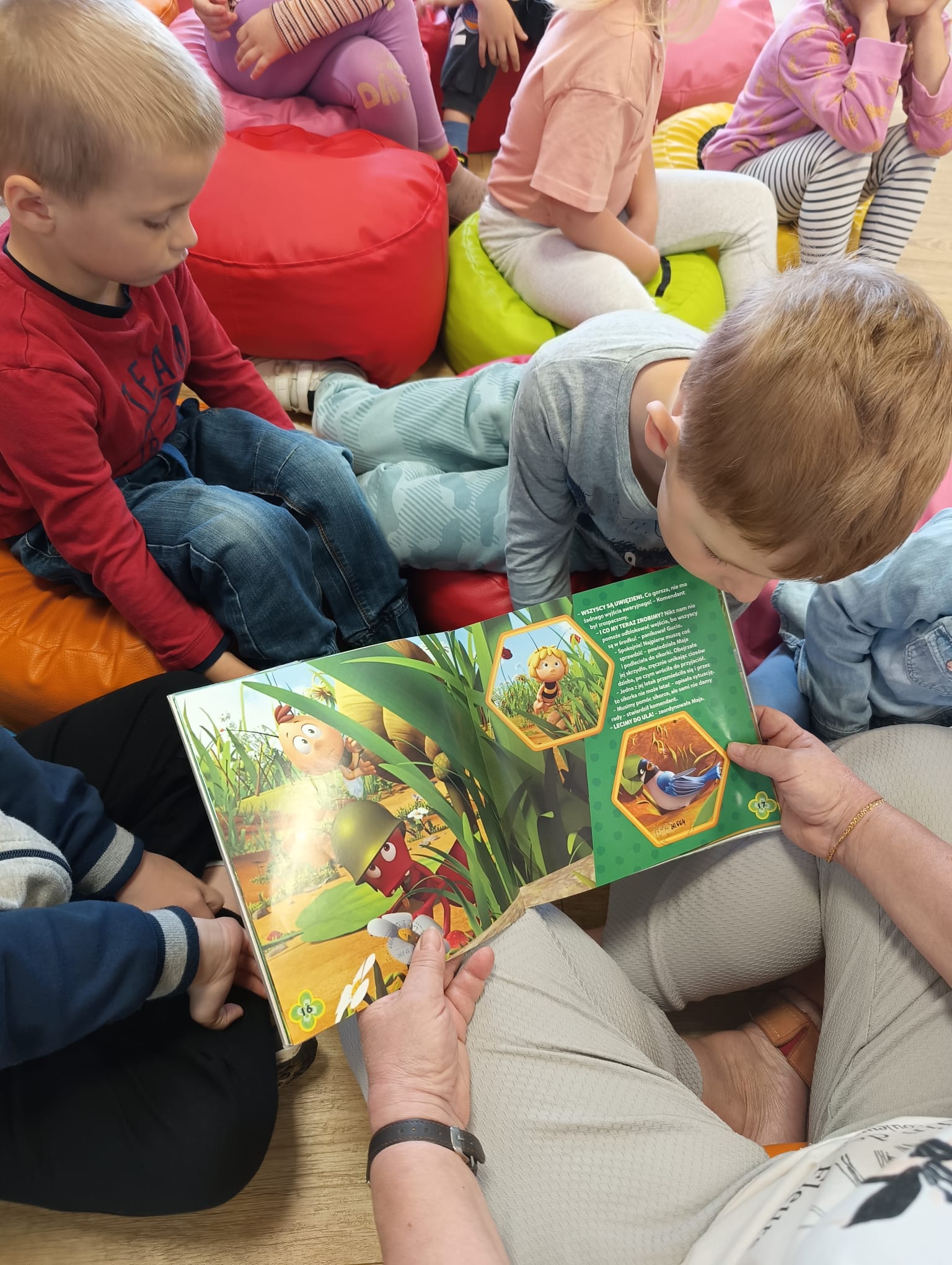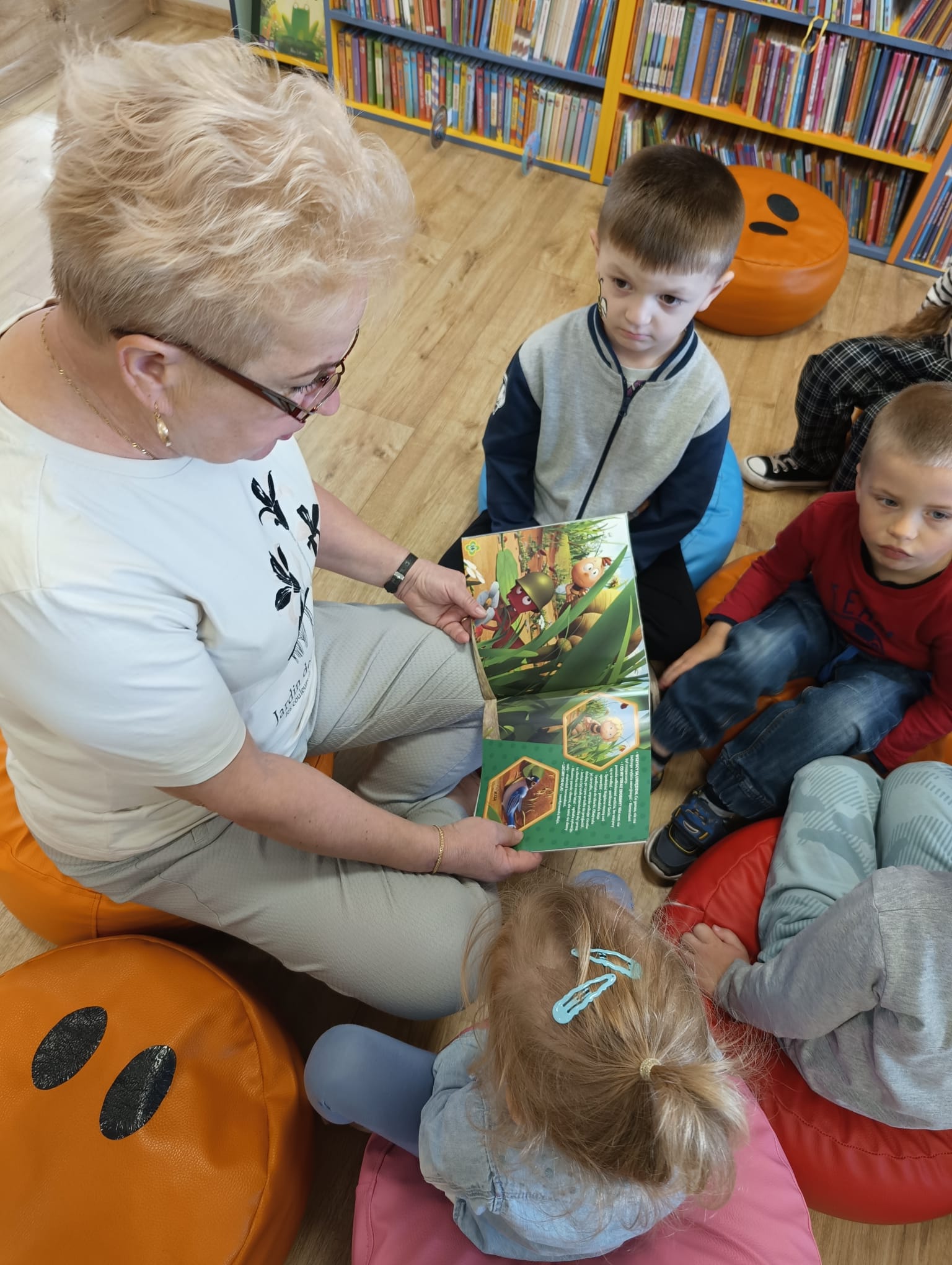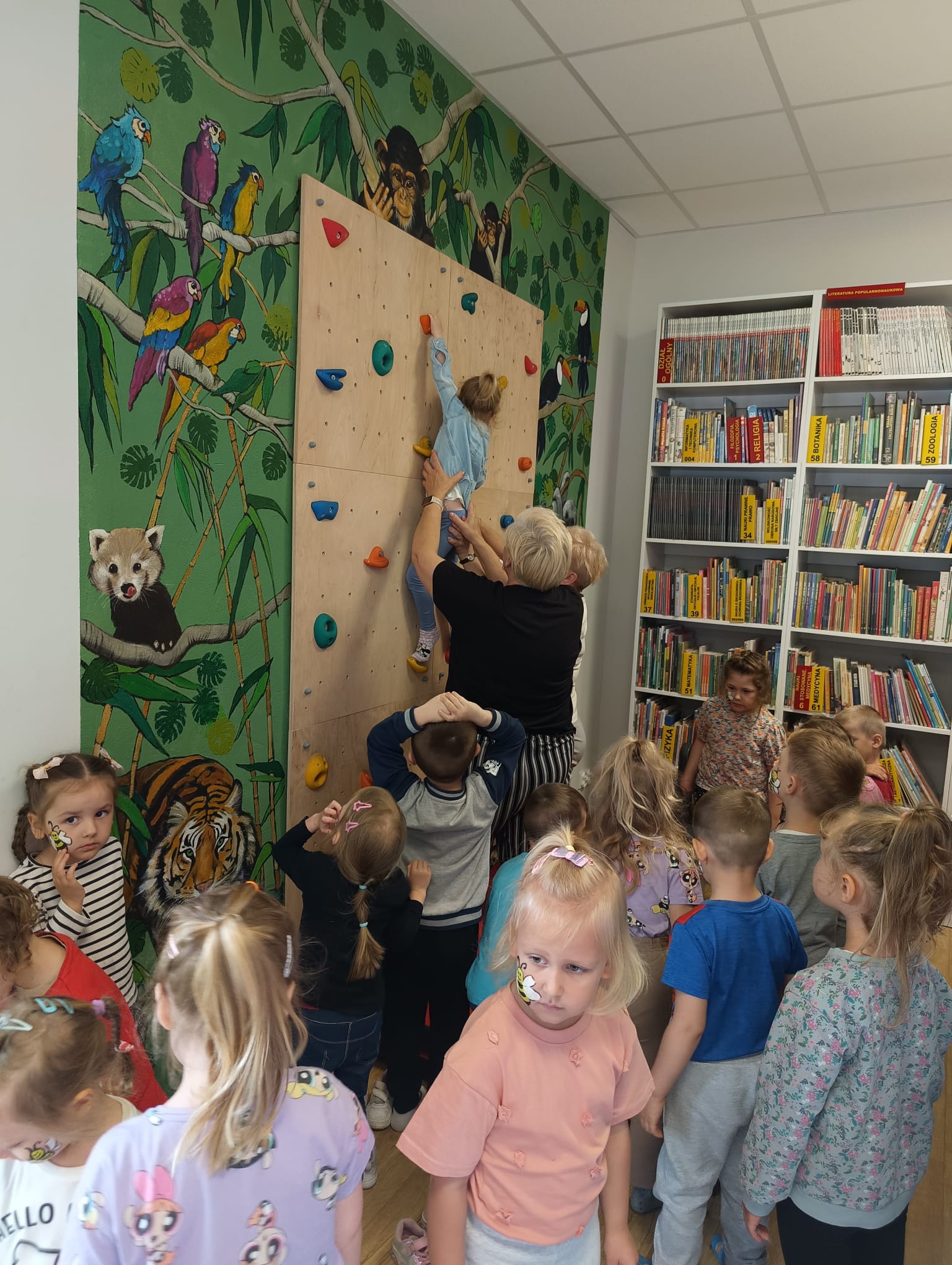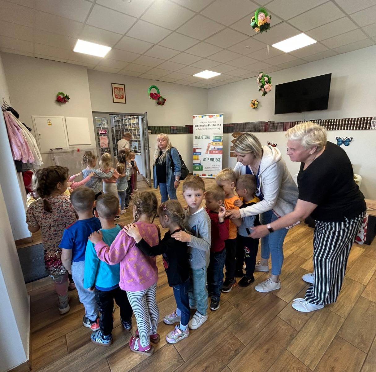 Dzisiaj gościliśmy wyjątkowych czytelników – grupę Pszczółki z Samorządowego Przedszkola w Dąbrowie Białostockiej, które przybyły wraz ze swoimi opiekunami. Przedszkolaki z ogromnym zaciekawieniem zwiedzały bibliotekę, odkrywając magiczny świat książek. Miały okazję zobaczyć, jak wiele wspaniałych historii czeka na swoich czytelników na kolorowych półkach.Wspólnie wykonaliśmy prace plastyczne inspirowane przygodami Pszczółki Mai oraz zakładki do książek. Dodatkowymi atrakcjami, ku wielkiej radości dzieci, były możliwość skorzystania ze ścianki wspinaczkowej oraz malowanie twarzy – Basia i Dorota z M-GOK wyczarowały na ich policzkach śliczne pszczółki.