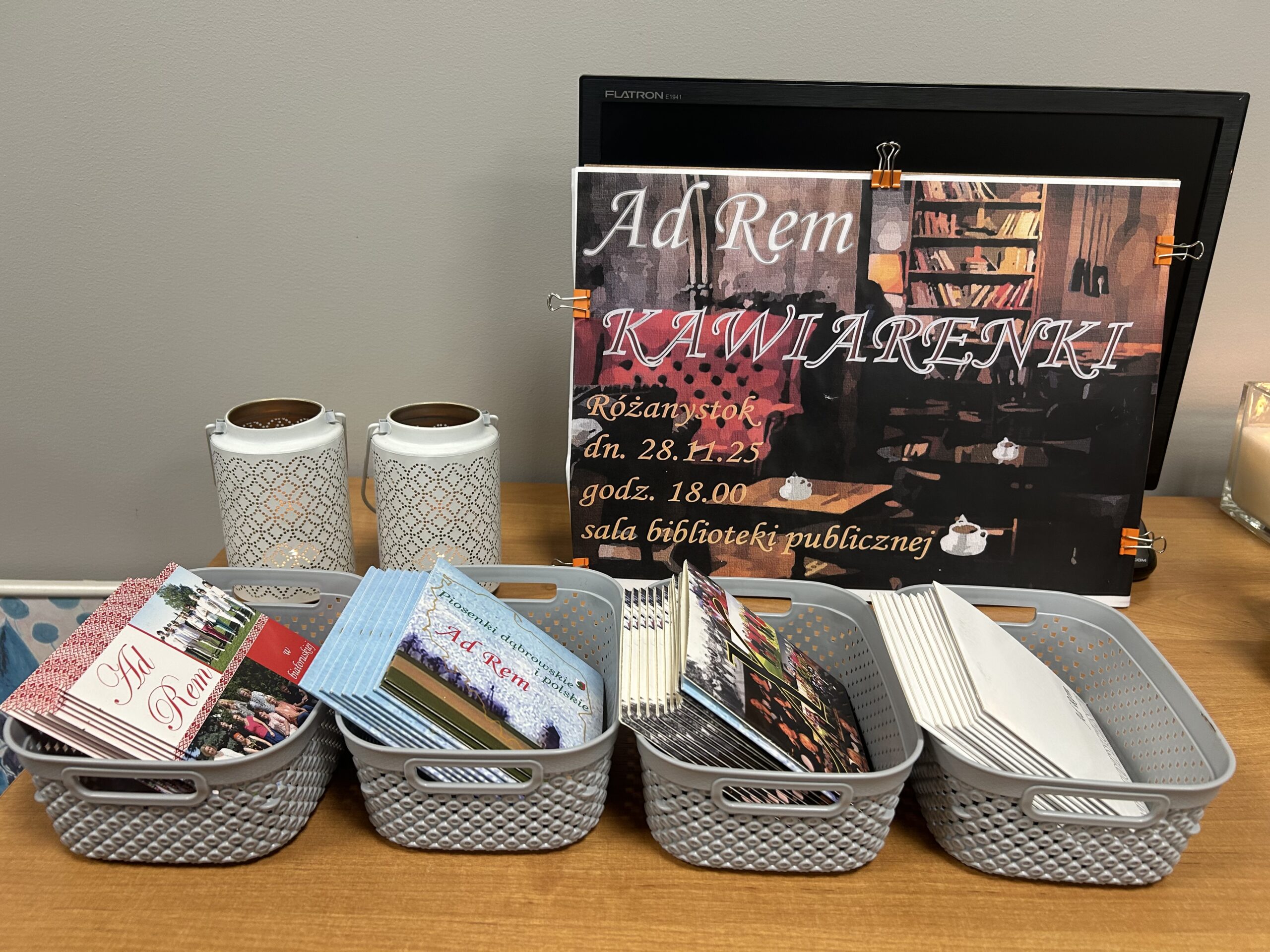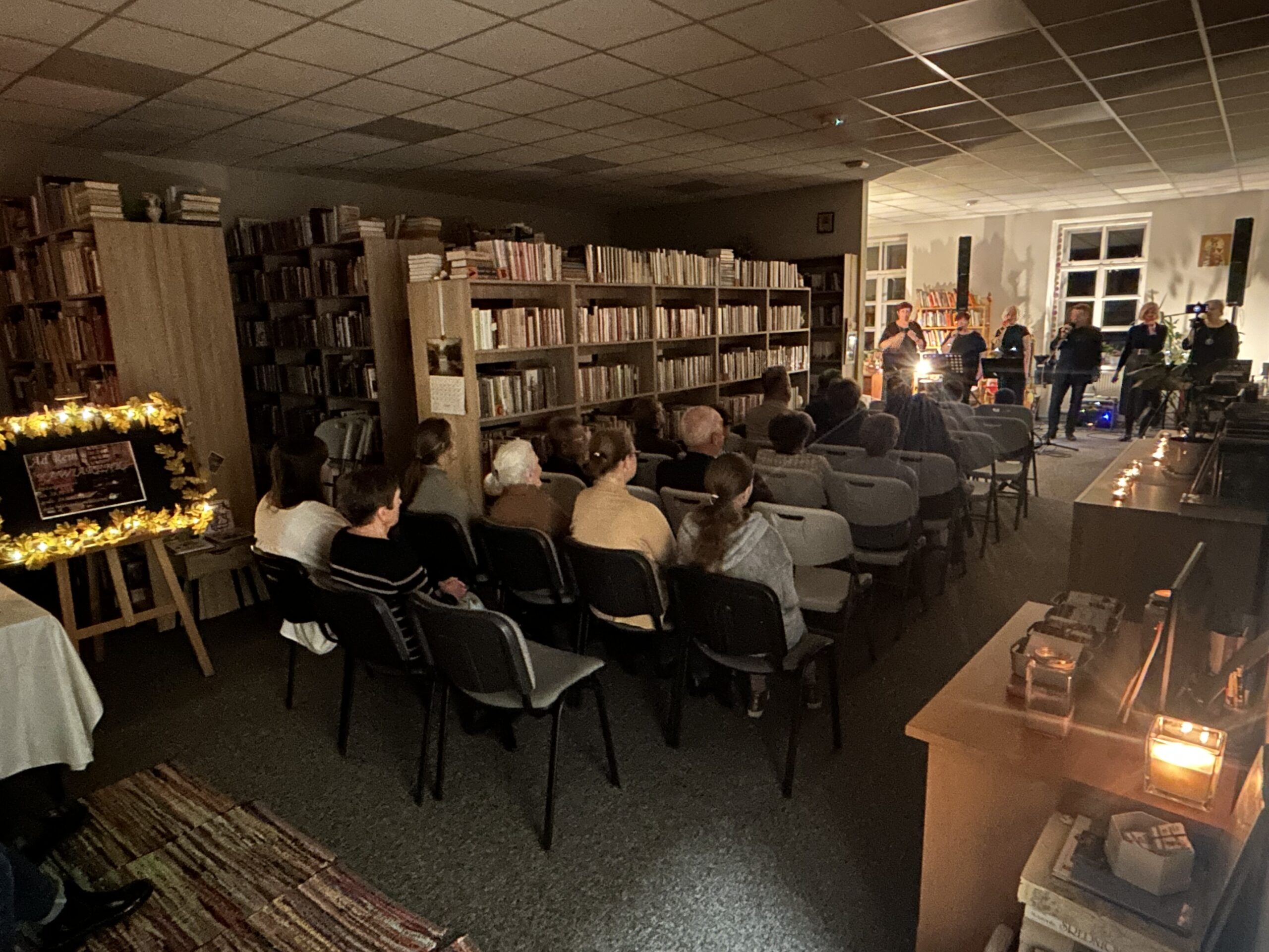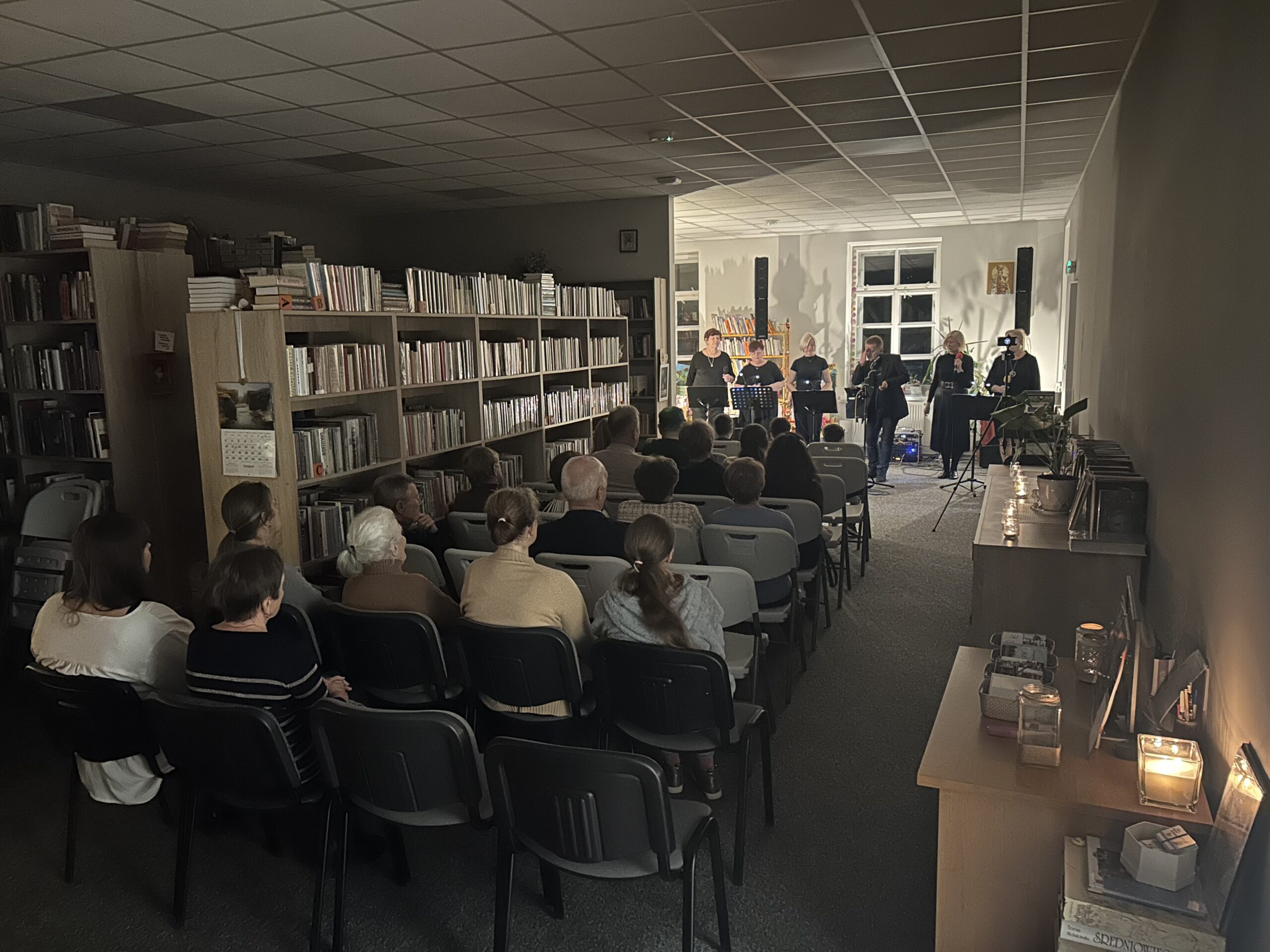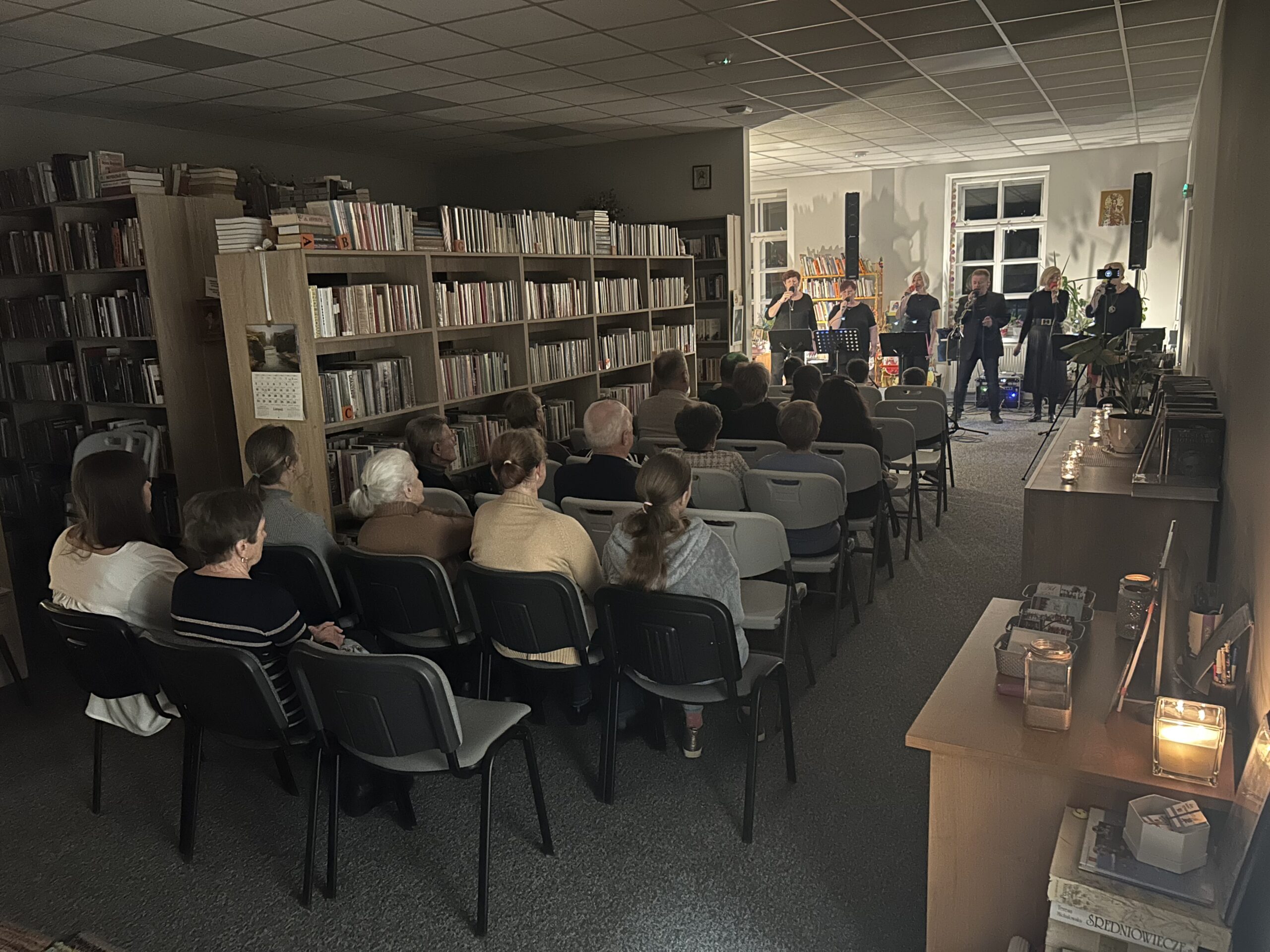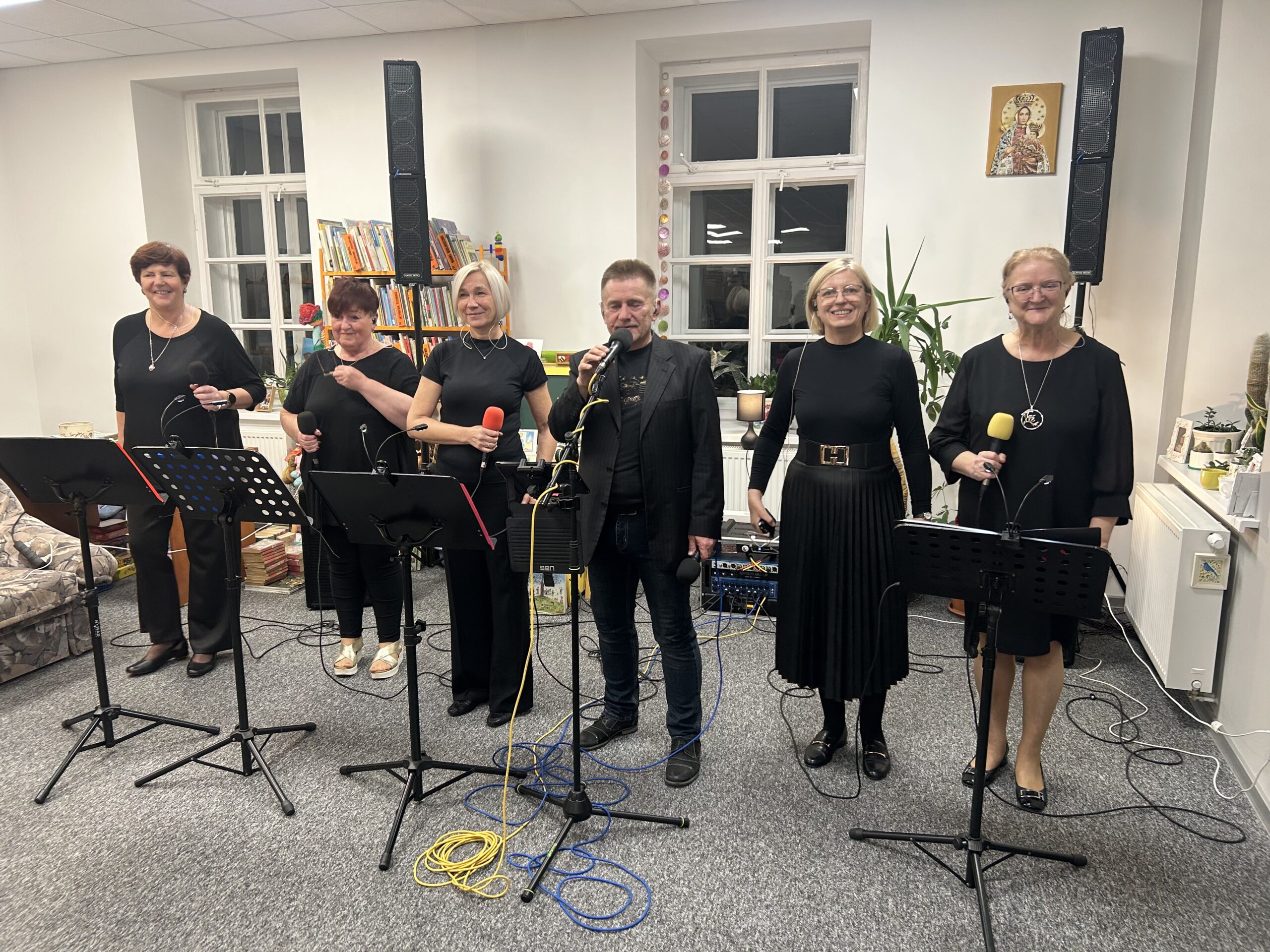 W miniony piątek (28 listopada) Filia Biblioteczna w Różanymstoku zamieniła się w nastrojową salę koncertową, goszcząc zespół Ad Rem pod kierownictwem muzycznym Pana Jarosława Woźniewskiego. Lokalna formacja dostarczyła publiczności wieczoru pełnego wzruszeń i refleksji. Kameralna przestrzeń biblioteki, otoczona regałami pełnymi książek, stworzyła niezwykłą aurę. Zamiast typowego hałasu koncertowego, publiczność oczekiwała w pełnym skupieniu, delektując się kawą, herbatą i ciastem. Ten wyjątkowy wieczór udowodnił, że kultura może rozkwitać z dala od wielkich sal koncertowych, a magia muzyki najlepiej działa w kameralnym gronie, gdzie artysta i słuchacz są ze sobą niemal bezpośrednio połączeni.